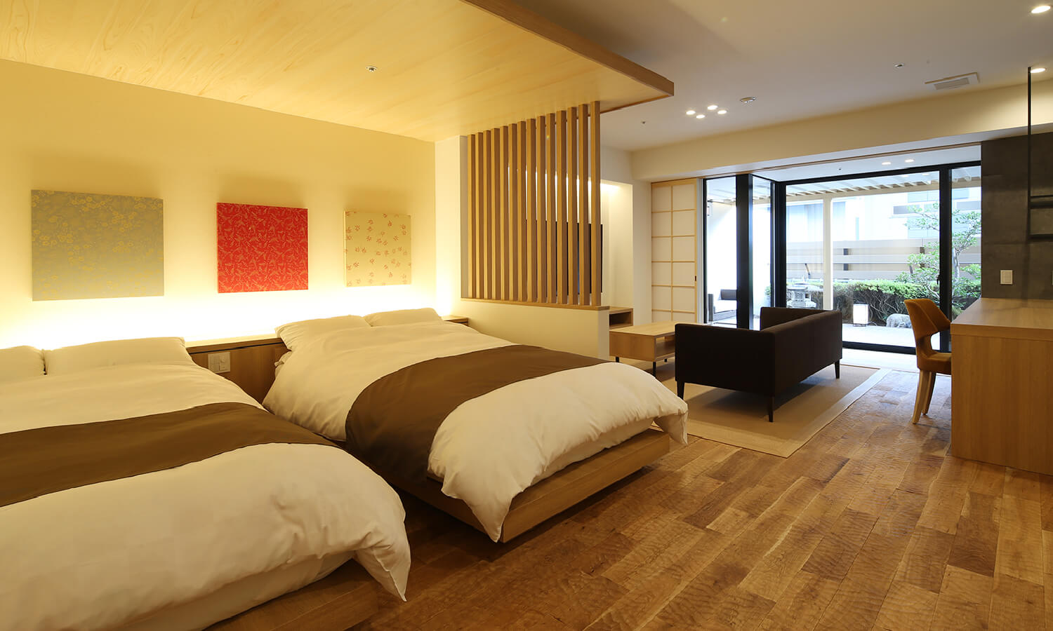お客様に京都の四季を感じながら、日常を忘れゆっくりとお過ごし頂けるよう、タイプの異なる8種類のお部屋をご用意しております。露天風呂を備えた「露天風呂付客室」、また和室と洋室を備えた「露天風呂付洋室」、そして1室限定の「露天風呂付和洋室」など、お客様の旅に合わせた最適なお部屋をお選び頂けます。