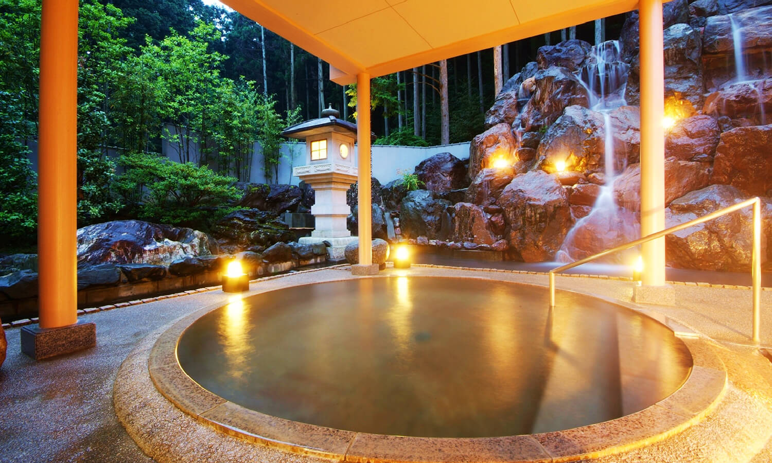 大浴場は、ゆったりと寛げる大きな浴槽がある「大黒の湯」、滝の水しぶきと川のせせらぎを楽しめる露天風呂「石風呂」、また緑を感じるながら寛ぐ「ひのき風呂」、さらに薬湯などもございます。もちろん、プライベート空間をお楽しみ頂けるよう貸切風呂もご用意。ご家族、カップルだけの特別なひとときをお過ごし頂けます。