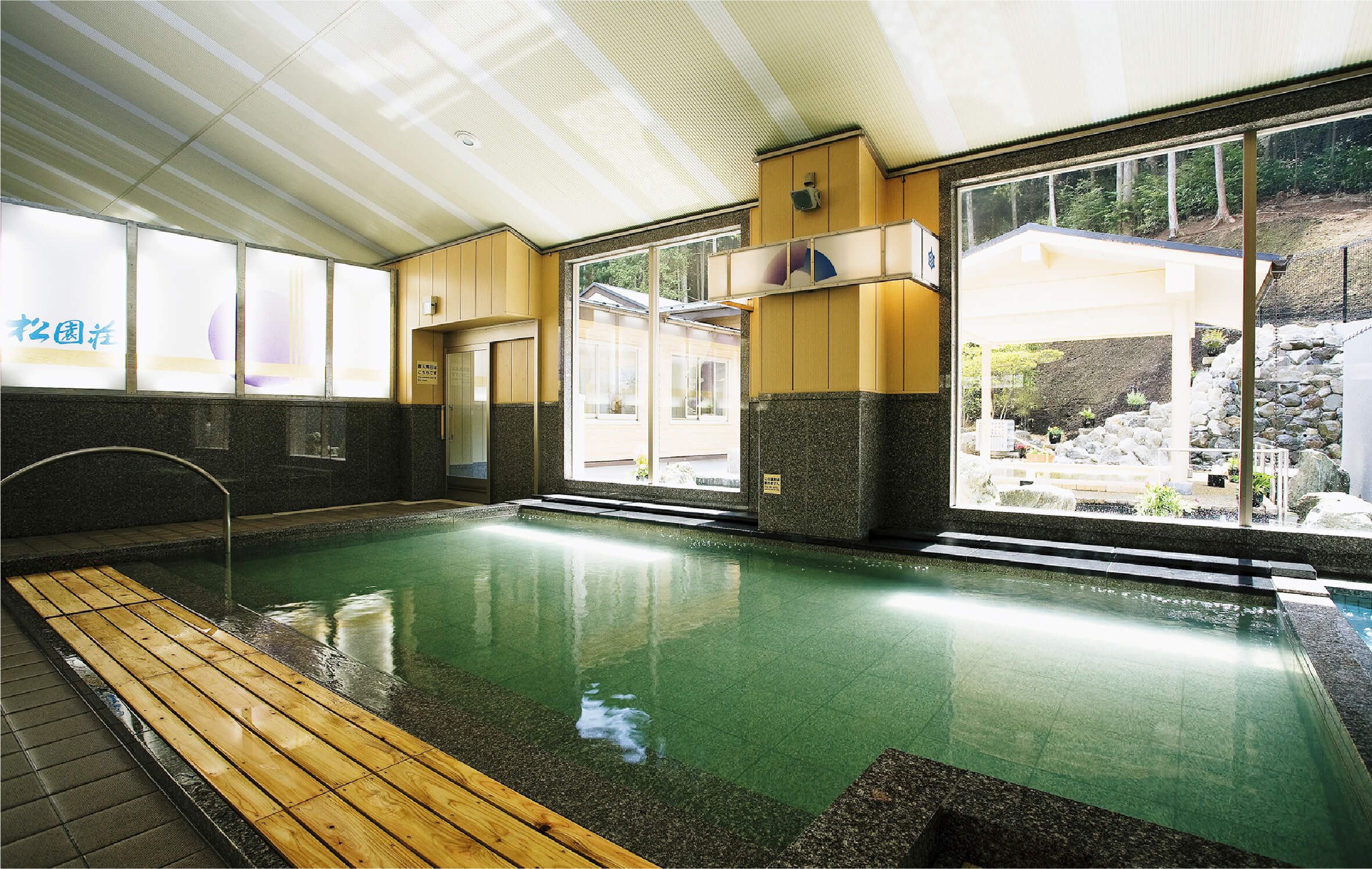 浴場に進むと先ず天井の高さと窓越しの緑に目を奪われます。広々とした内湯はジャグジーに寝湯等バリエーションが豊富です。
