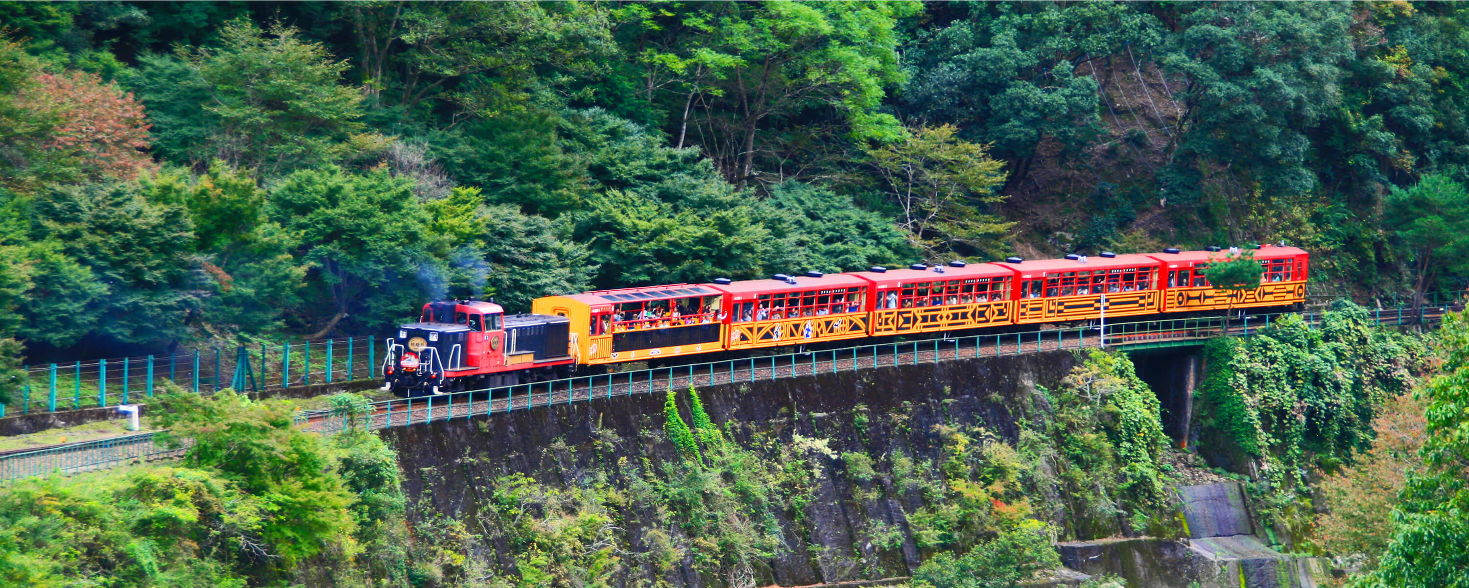 京都で観光&ランチのあとは、嵯峨トロッコ列車にゆられ、雄大な景色を眺めながらの25分の旅を。