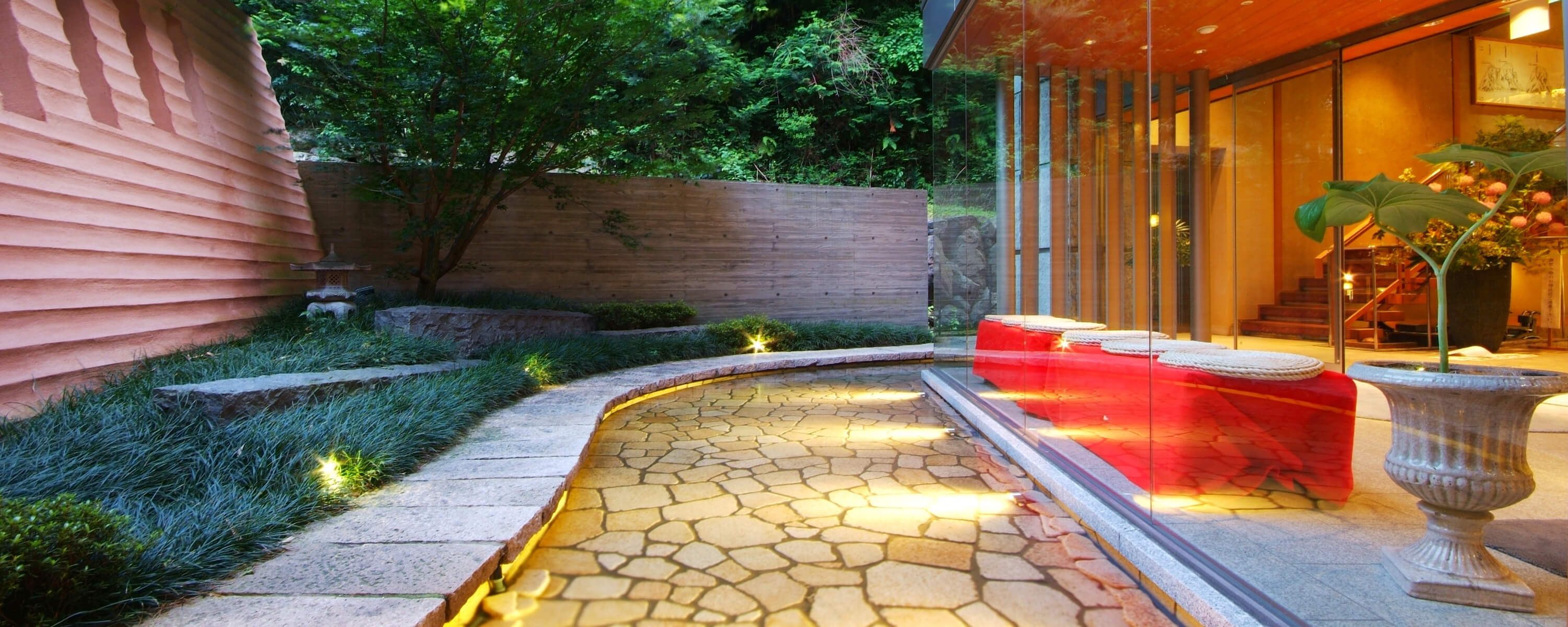 緩やかな階段に沿って水路が設けられ、客室へと続く通路には犬矢来(いぬやらい)を配置。歩を進めるごとに、日常から解き放たれ、時間の流れがゆっくり穏やかに変わり始めます。